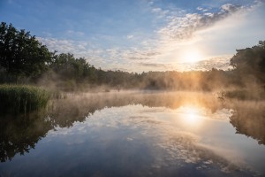 Droneopname van de dageraad boven de Vlaamse Kempen.