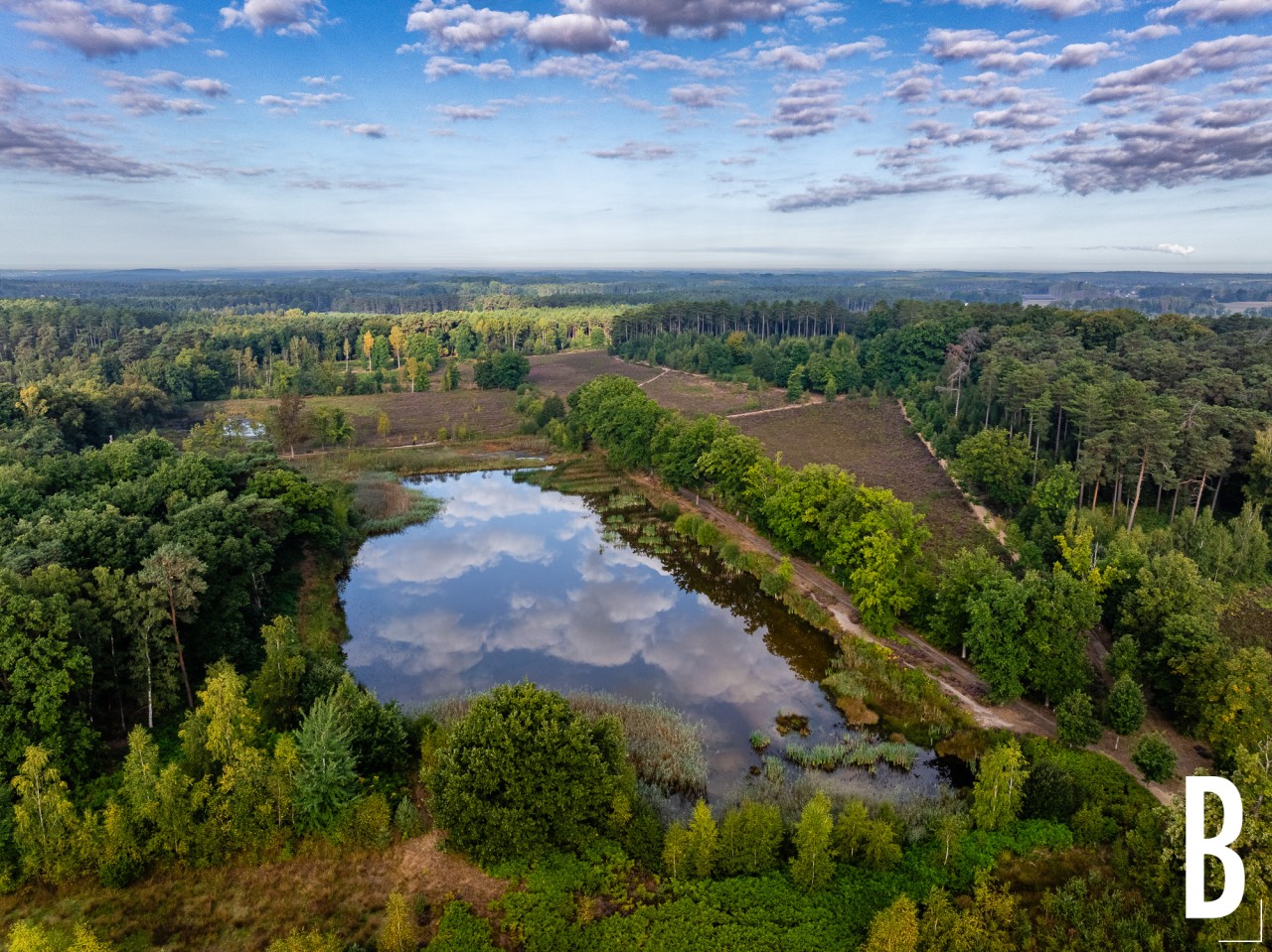 Luchtfoto van het verlichte heidegebied tijdens zonsopgang.
