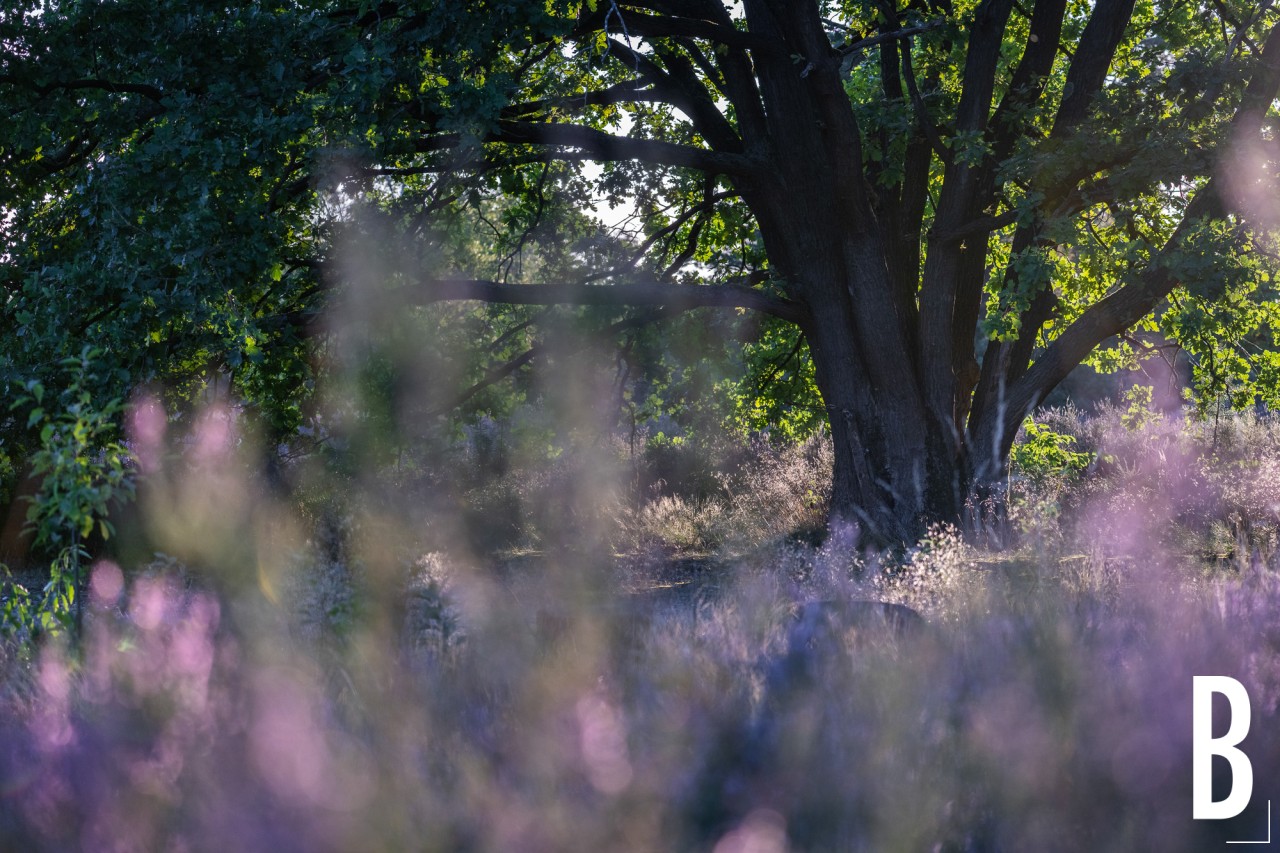 Prachtig tegenlicht over de bloeiende struikheide bij Genk.