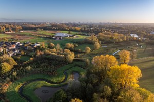 Drone-opname van de meanderende Zuunbeek tijdens een mistige herfstochtend.