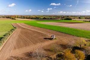 Dronebeeld van de stalen kubus die uitkijkt over de glooiende Pajotse akkers.