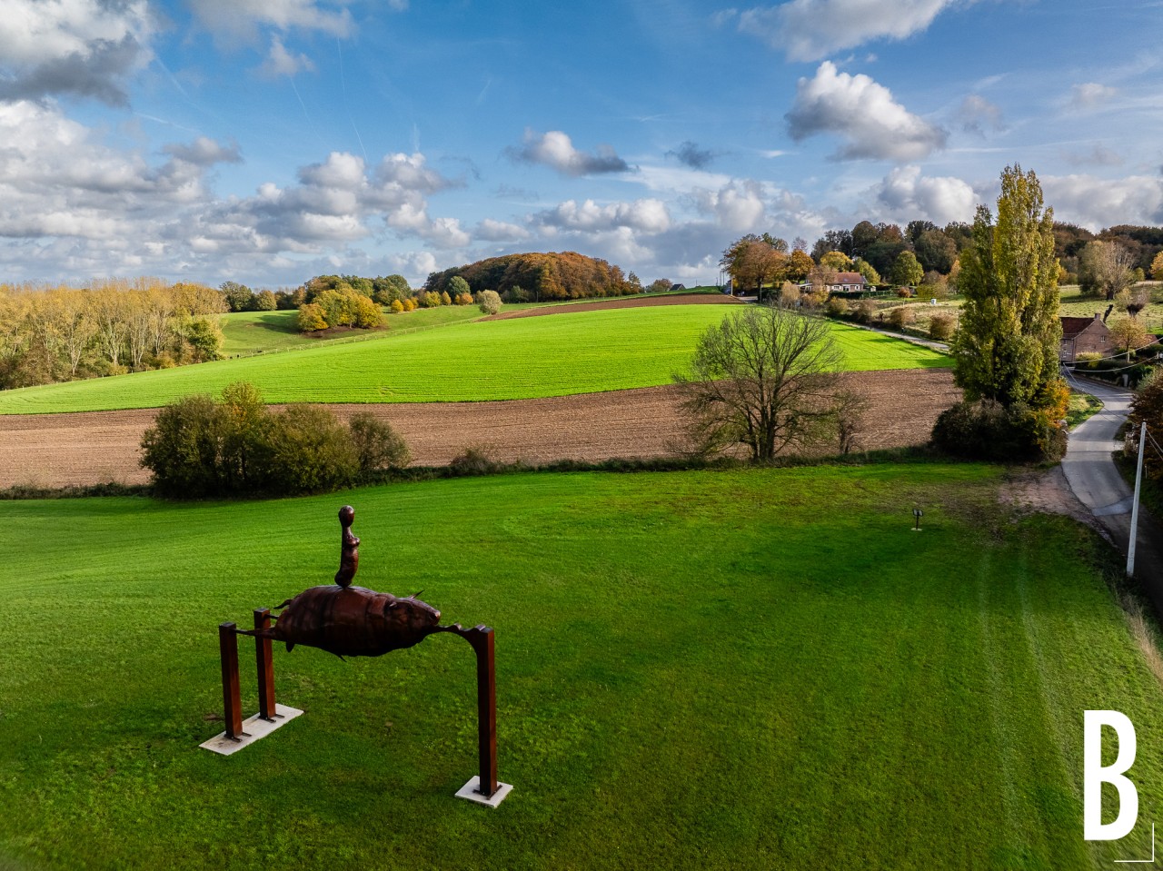 Luchtfoto van de indrukwekkende sculptuur in het landschap van het Pajottenland.