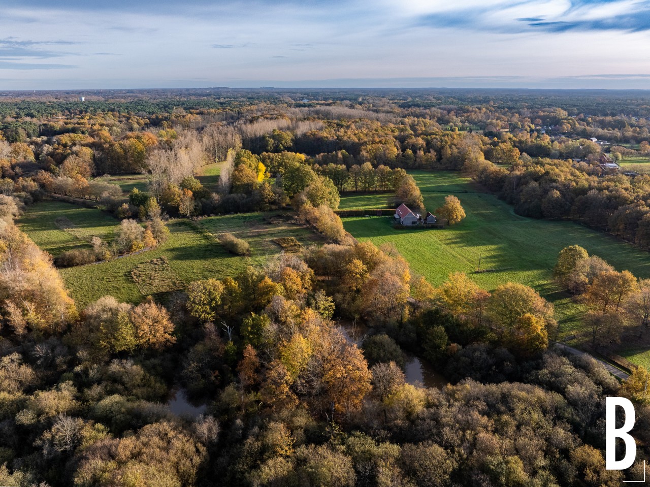 Drone-opname van het moerasgebied en de meersen in de herfstige Dijlevallei.