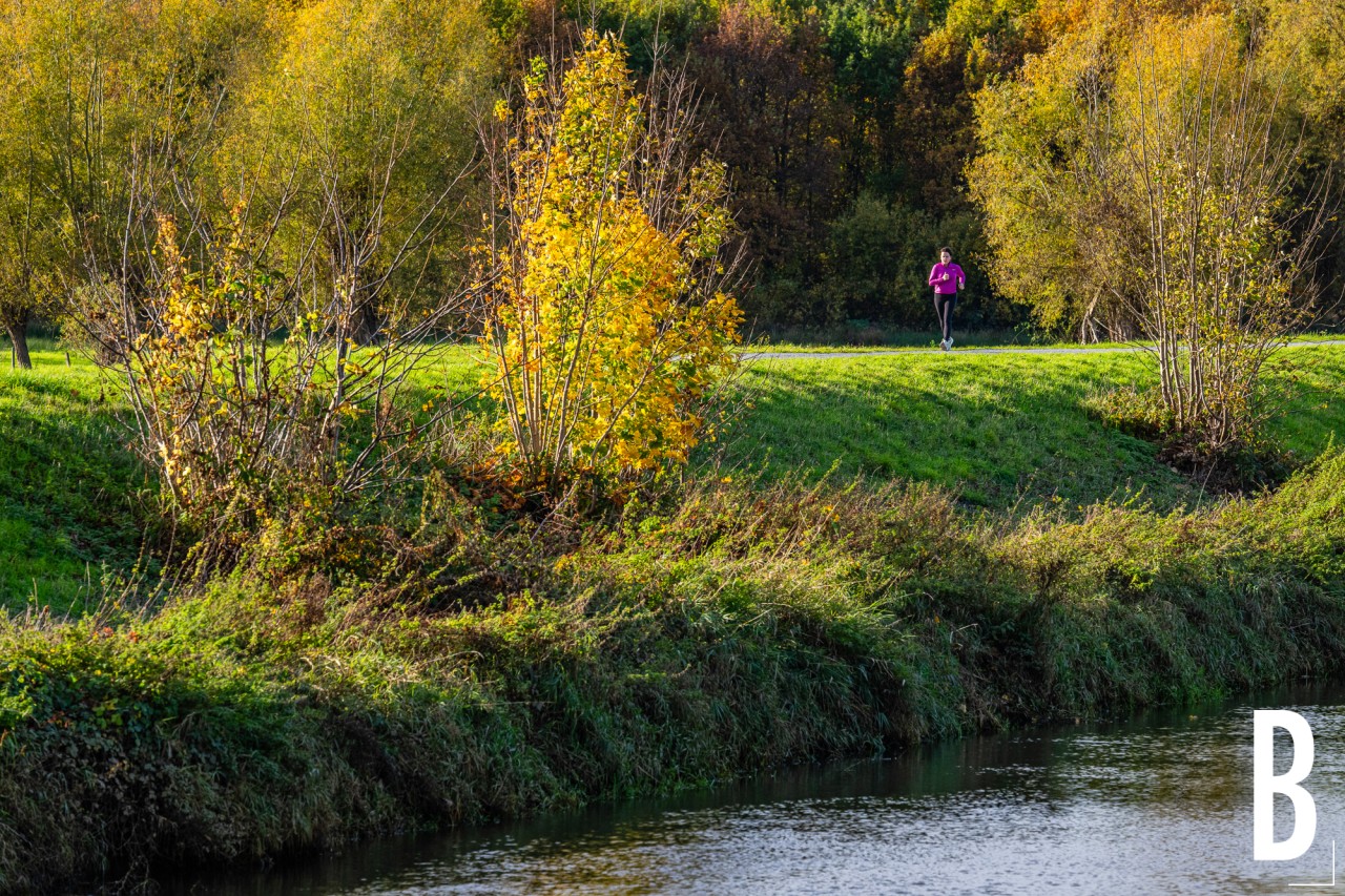 Wandelaars en fietsers genieten van het herfstweer op het jaagpad in Bonheiden.