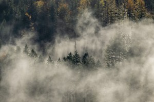 Zicht op het dorp spodnja sorica met de kerk in de mist tijdens het najaar te spodnja sorica.