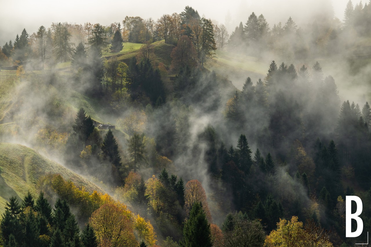 Zicht op de bomen en de heuvelflank in de mist tijdens de ochtend te spodnja sorica.