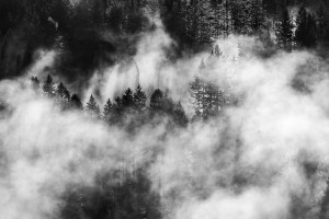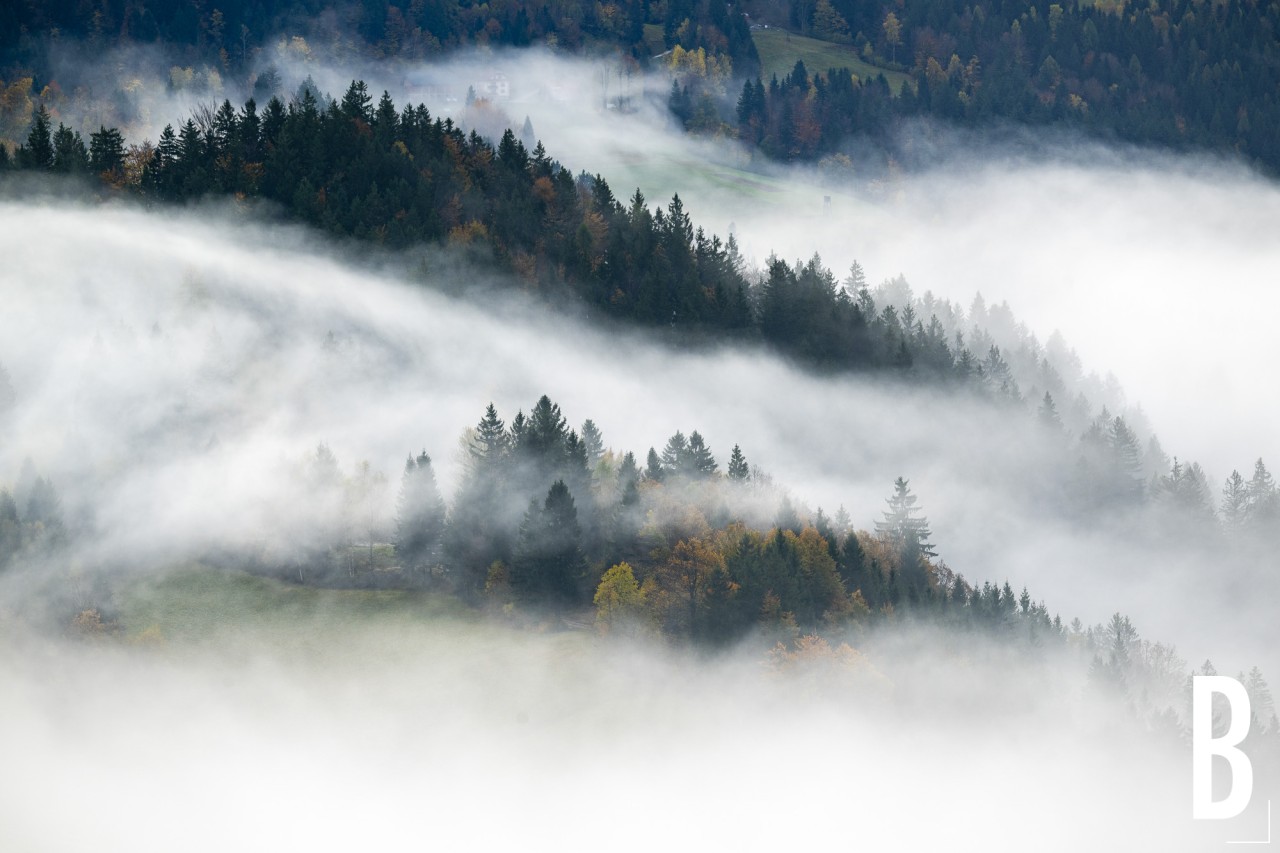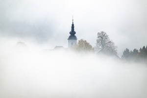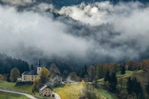 Zicht op de kerk en de heuvels in de mist tijdens de ochtend te spodnja sorica.