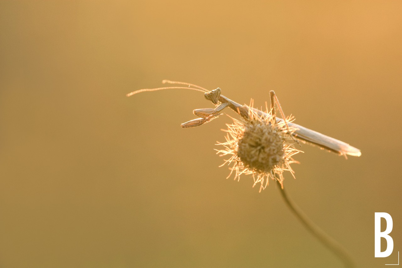 Bidsprinkhaan in tegenlicht met een egale achtergrond