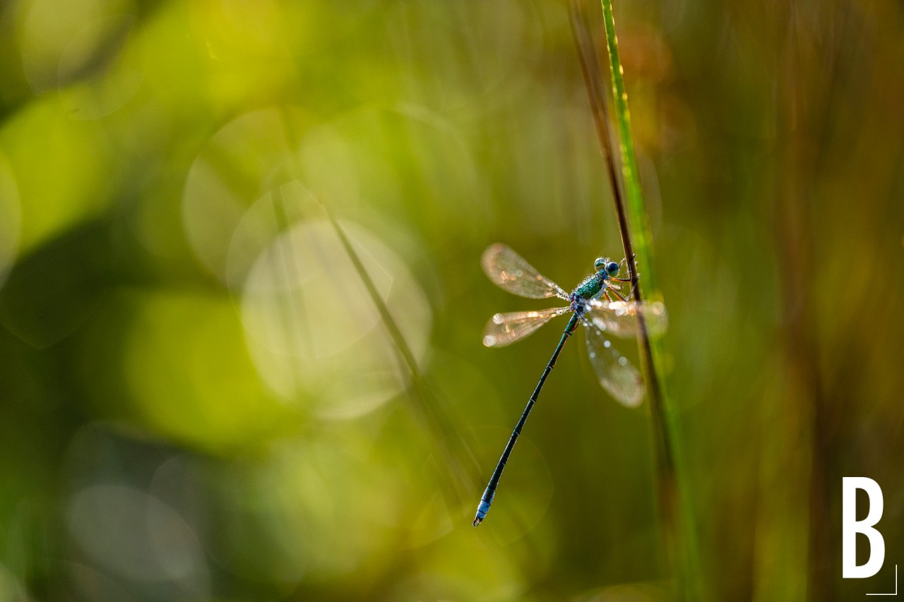 Een mannetje Tengere pantserjuffer warmt zich op in de eerste zon.