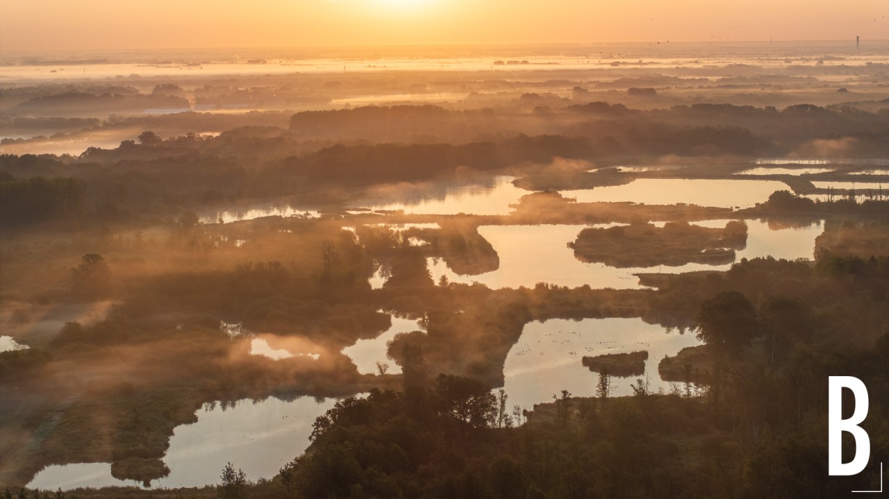 Natuurgebied De Luysen met haar talrijke vijvers gezien vanuit de lucht op een mistige najaarsochtend.