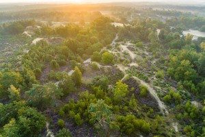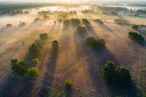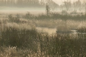 Zonnestralen priemen door het gebladerte van een boom in de Demerbroeken. De grassen in de voorgrond lichten prachtig op in het ochtendlicht.