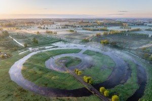 De natte Demerbroeken op een mistige zomerochtend gezien vanuit de lucht.