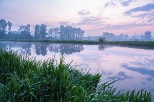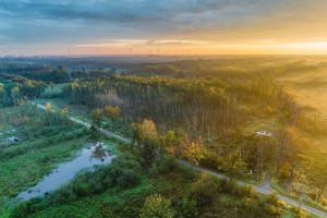 Natuurgebied de Kalkense meersen op een mistige najaarsochtend gezien vanuit de lucht.