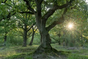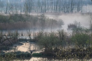Natuurgebied de Kruibeekse polder met grachten, vijvers en dode bomen op een mistige voorjaarsochtend gezien vanuit de lucht.