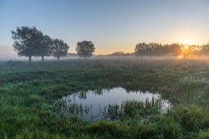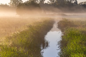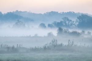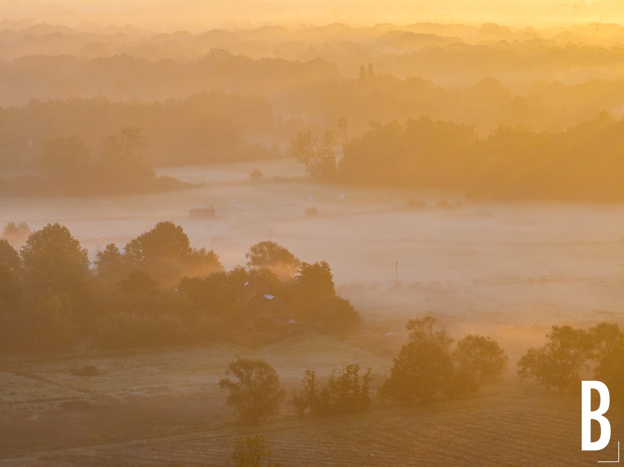 Laagjeslandschappen in het Mechels broek gezien vanuit de lucht op een mistige najaarsochtend.