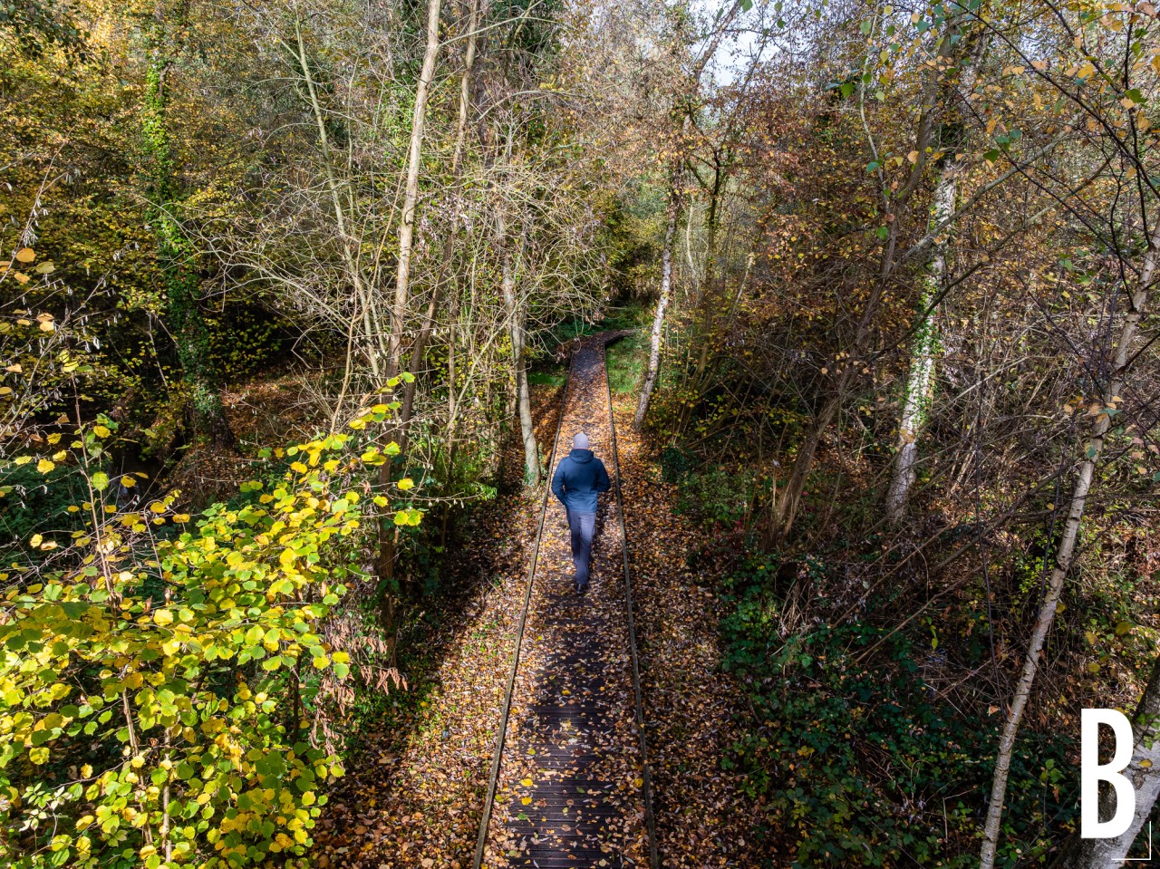 Drone-opname van de historische watermolen en de omgeving in herfstkleuren.