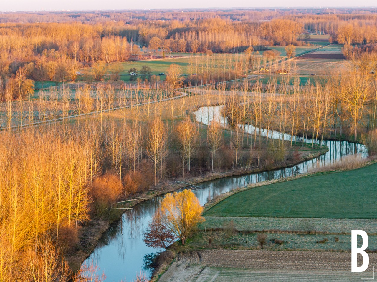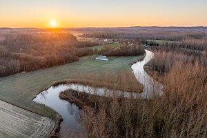 Dronefoto van de dijle in de riviervallei van natuurreservaat wijgmaalbroek tijdens de ochtend te wijgmaal.