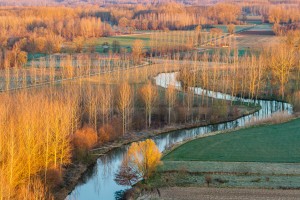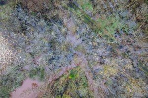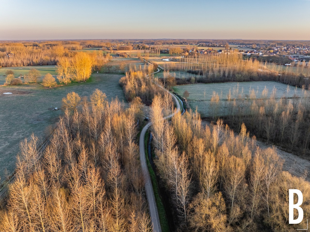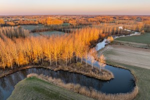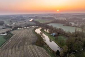 Dronefoto van de dijle in de riviervallei van natuurreservaat wijgmaalbroek tijdens de ochtend te wijgmaal.