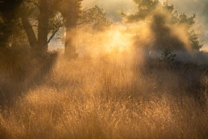 Mist hangt boven de moerassen van natuurreservaat de Blankaart op een ochtend in het late voorjaar.