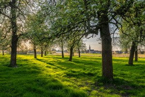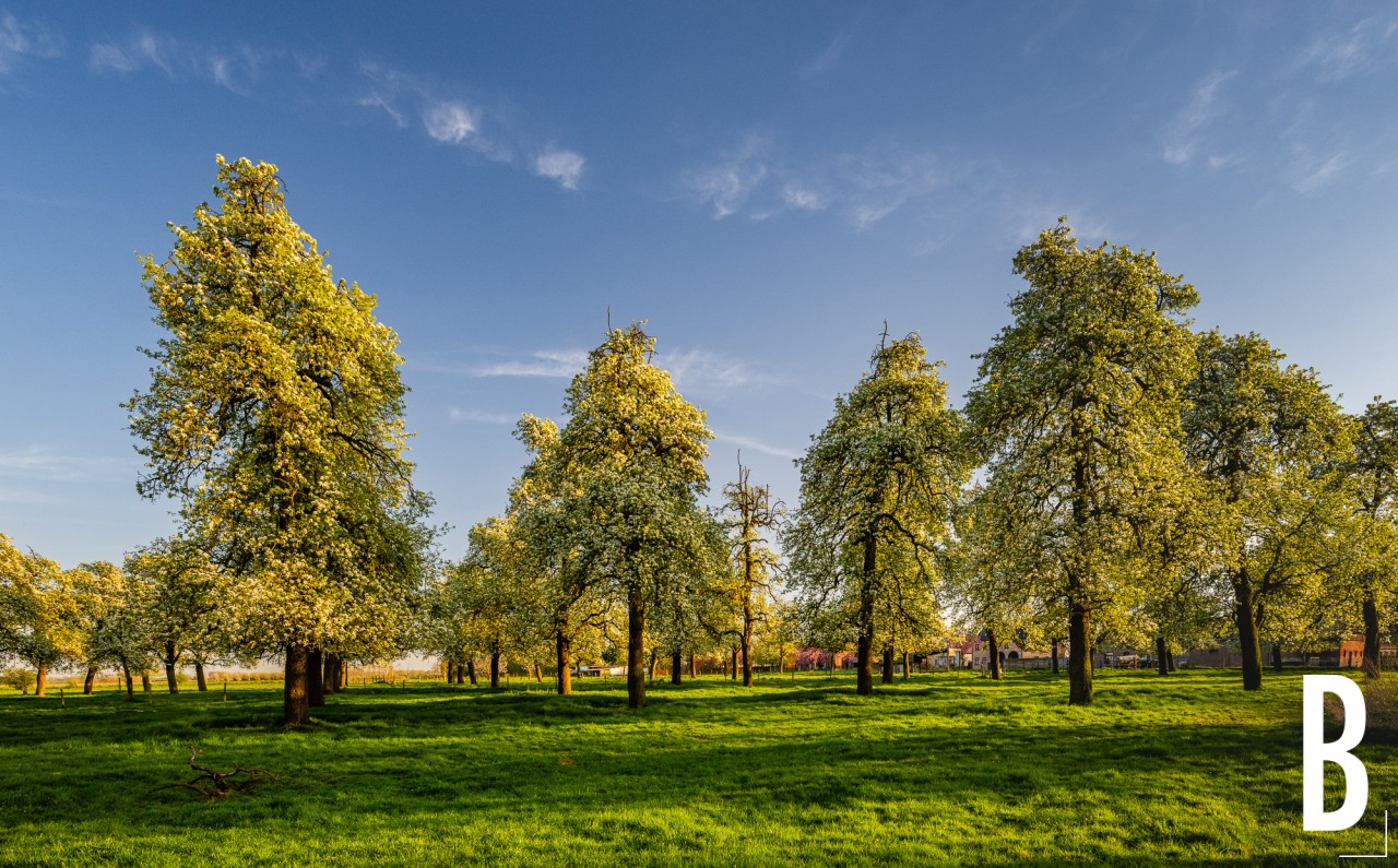 Zicht op de bomen in een bloeiende boomgaard tijdens het voorjaar te linter.