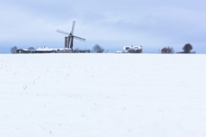 Rechte lijnen in een akker met een molen aan de horizon en een gekleurde wolkenlucht tijdens zonsopgang