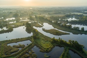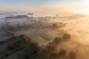 De kerk van Schellebelle aan de oevers van de Schelde steekt boven de wolken uit op een mistige najaarsochtend.