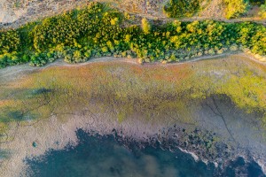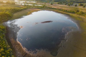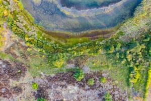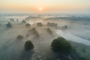 De opkomende zon zorgt voor een prachtig lichtspel en bonte kleuren aan de oevers van een ven vol met riet in natuurreservaat de Maten.