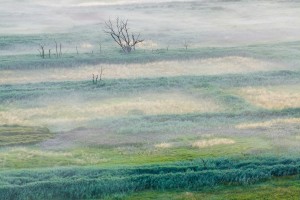 Natuurgebied de Wijmeers op een mistige najaarsochtend gezien vanuit de lucht.