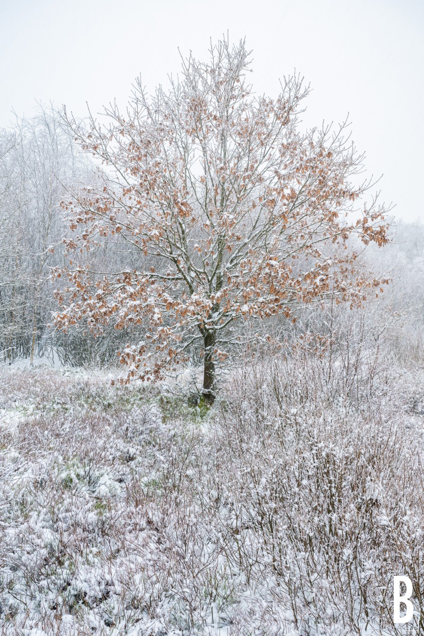 Een jonge beuk in winters kleedje op Fagne Malchamps.