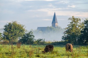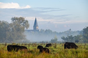 Koeien in een mistige Scheldevallei in Zingem.