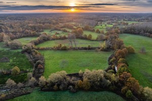 Beukenbos in de herfst met zonlicht en mist in de verte.