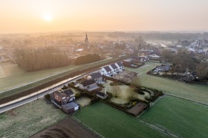 Luchtopname van het kleinschalige landschap met hagen og bosjes in de mist.