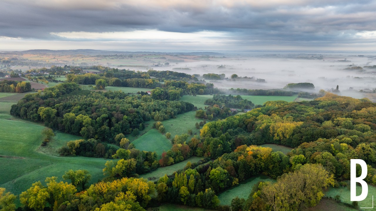 Luchtopname van het kleinschalige landschap met hagen en bosjes in de mist.