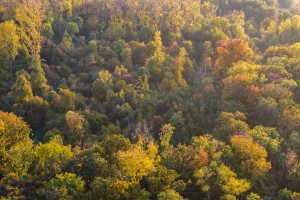 Luchtfoto van de verkleurende boomkruinen van Bos 't Ename bij zonsondergang.