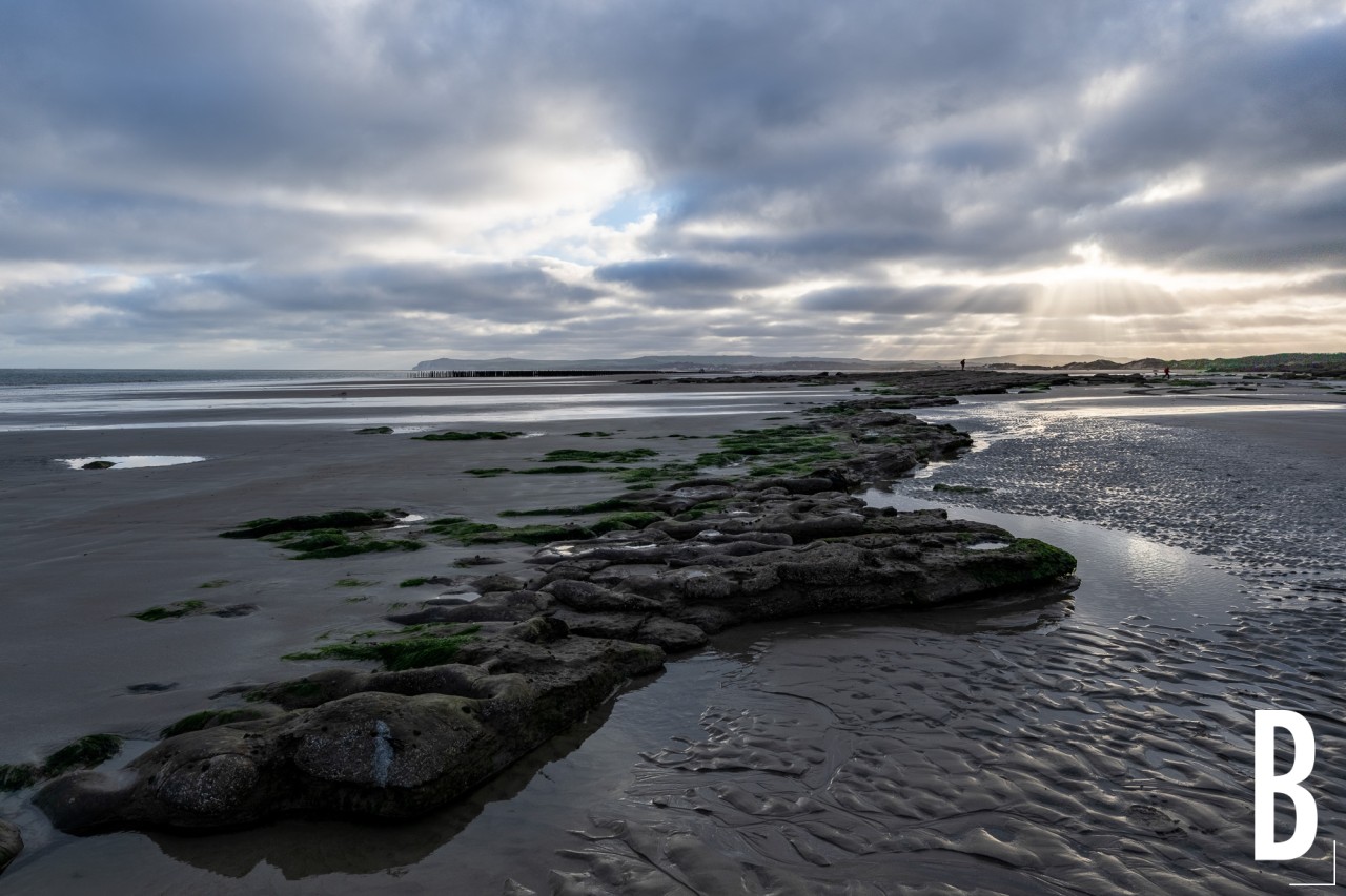 Zicht op de rotsen en getijdepoel op het strand van de opaalkust te audinghen.