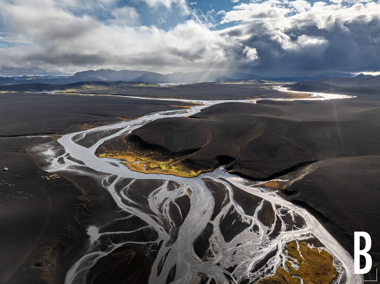 De aswoestijn en bergen van Veidivatn omringen de meanderende rivier Vatnskvisl.
