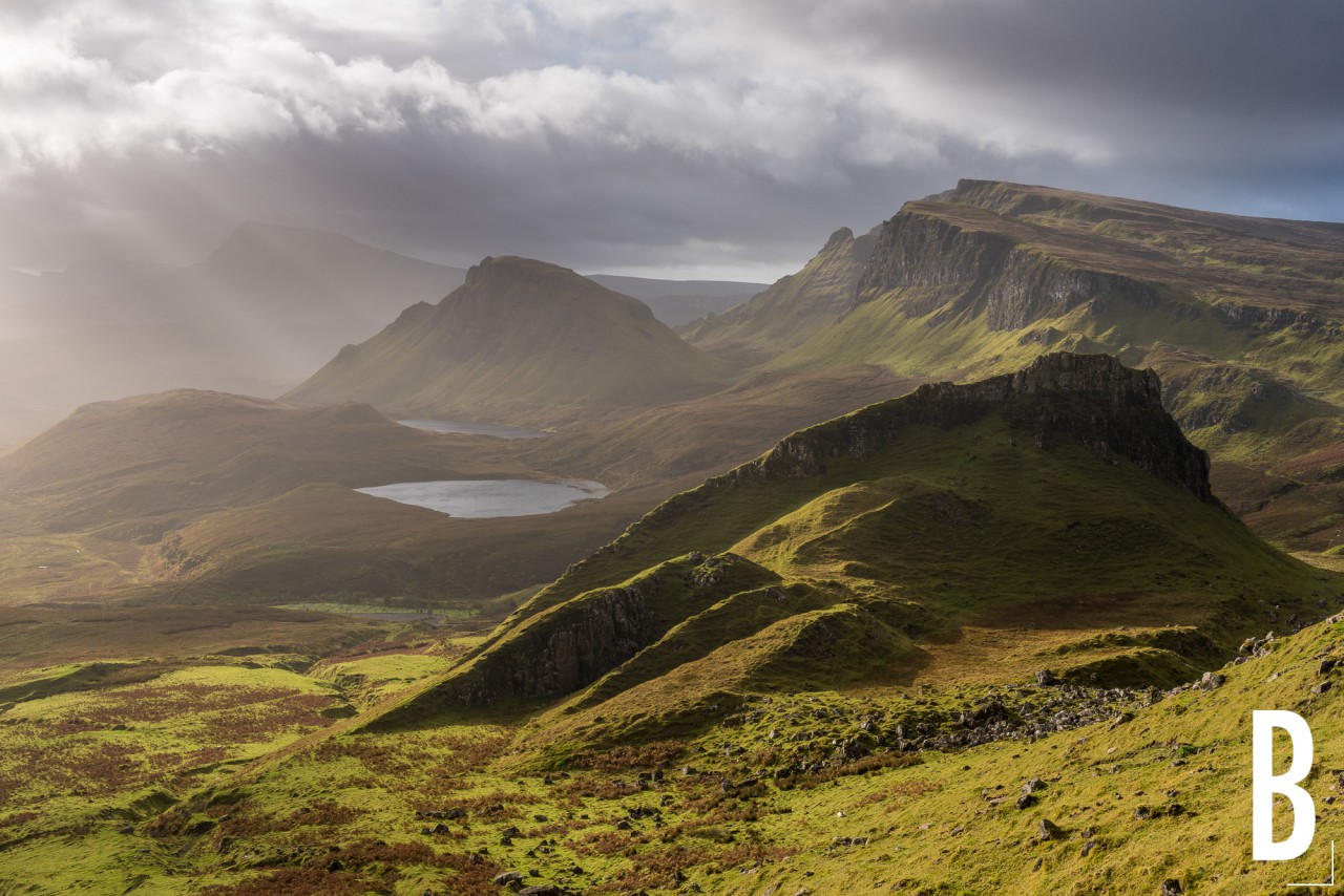 Woest landschap van bergen en een meertje onder een dreigende wolkenlucht in de herfst