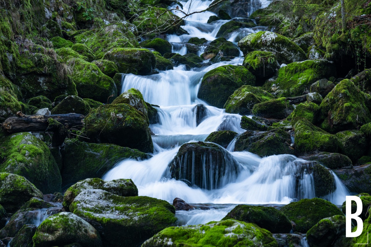 Detail van de Kroparica rivier omgeven door stenen bedekt met mos.
