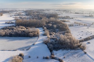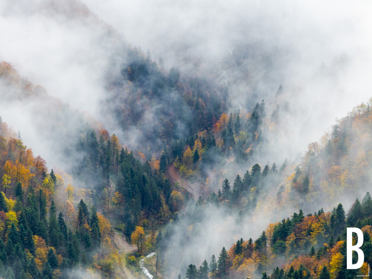 Luchtfoto van de glooiende heuvels en de najaarskleuren in de vroege ochtendmist.