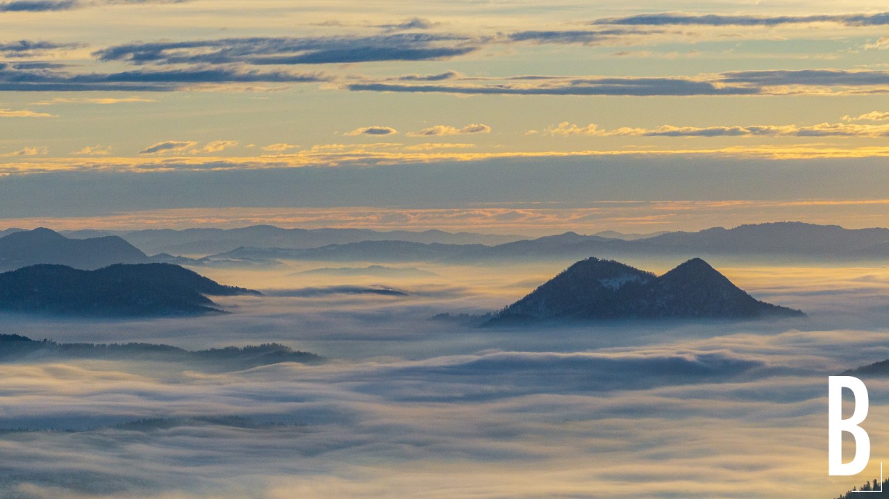 De bergen en valleien van Skofja Loka gehuld in mist op een winterse ochtend.