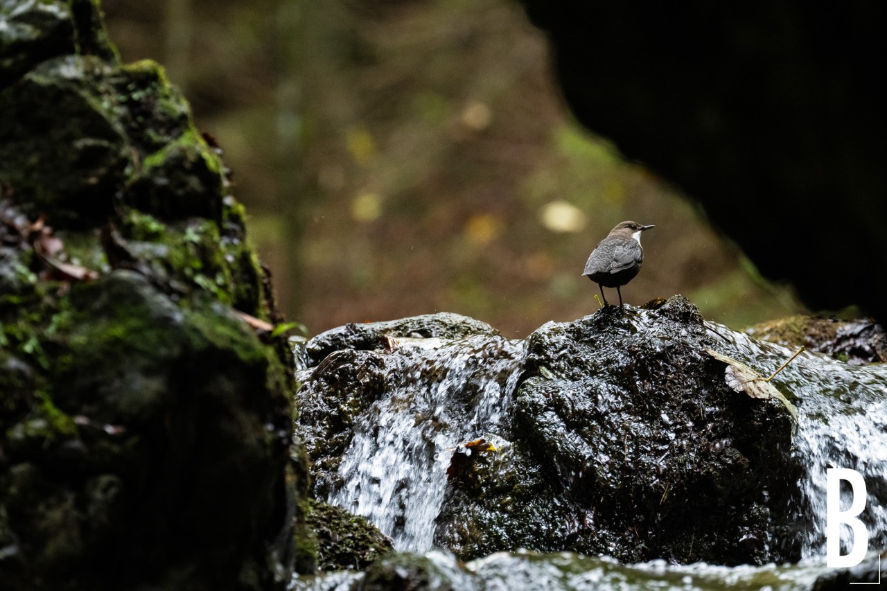 Een waterspreeuw (Cinclus cinclus) zit langs de beek in de Diery-kloof.