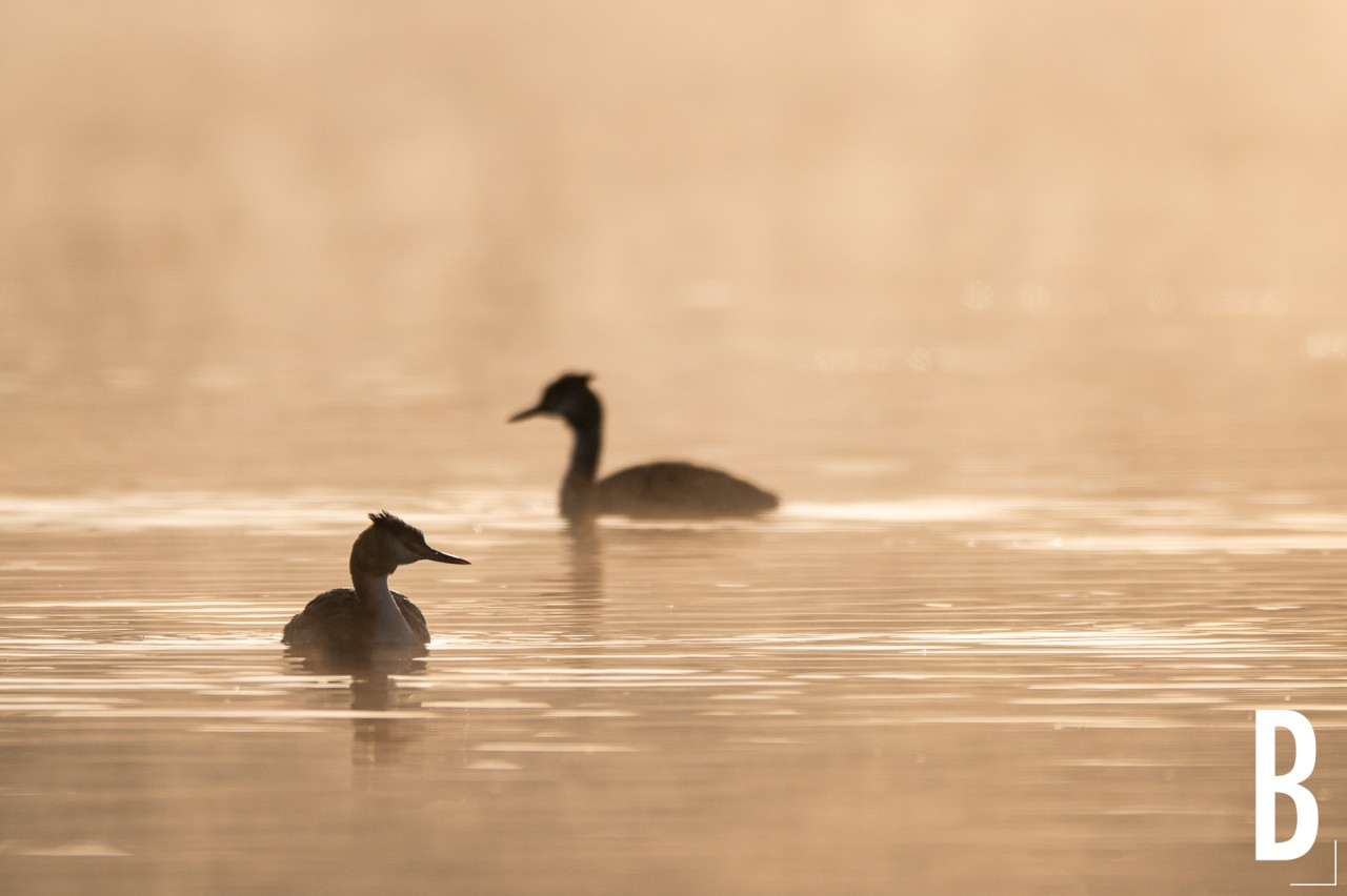 Een koppel futen bij zonsopgang op een mistige ochtend in de moerassen van Harchies.