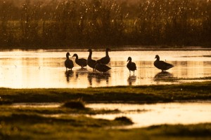 Een koppeltje Grauwe ganzen zit op een dode tank in de moerassen van Harchies.