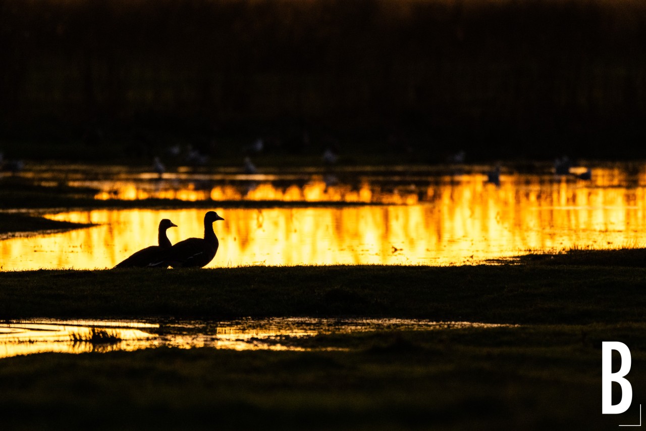 Sfeervolle opname van een groep ganzen in het moeras van De Blankaart tijdens de gouden uren.