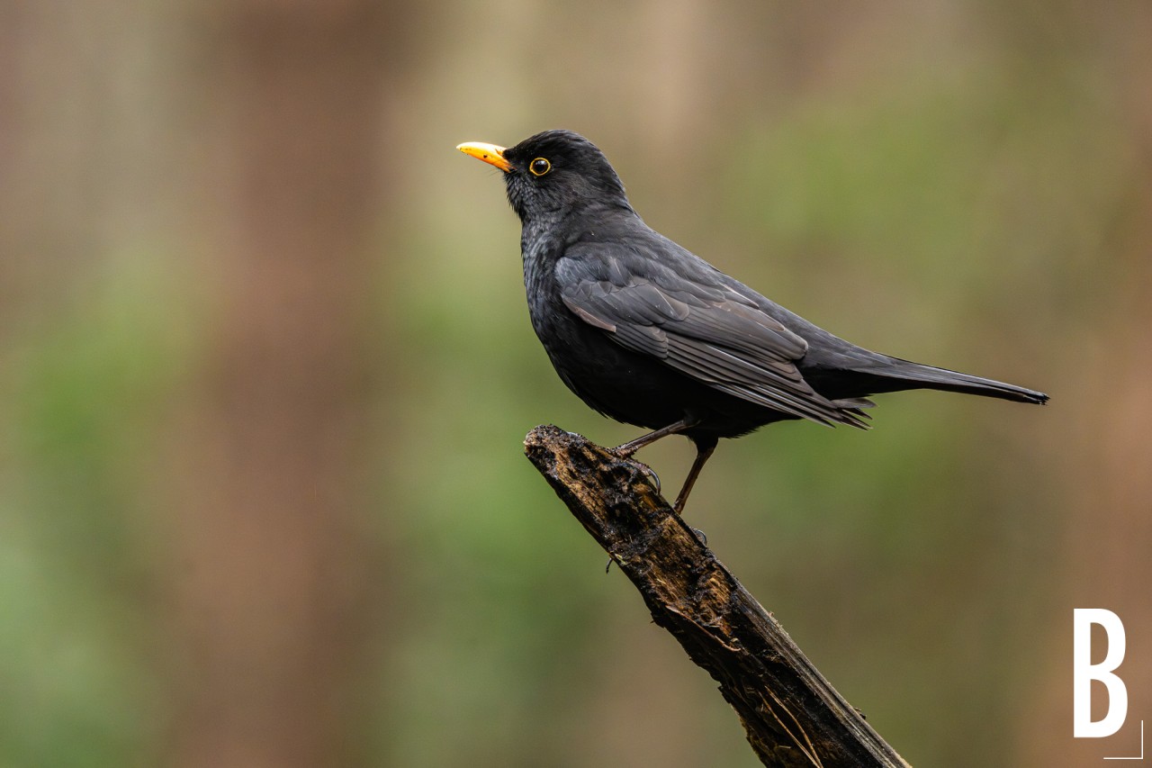 Een mannetje merel (Turdus merula) rustend op een tak tijdens de wintermaanden.