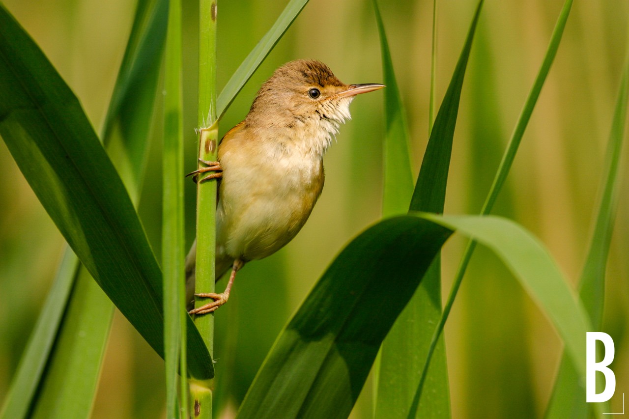Een kleine karekiet (Acrocephalus scirpaceus) zingend vanuit het riet in de meersen.