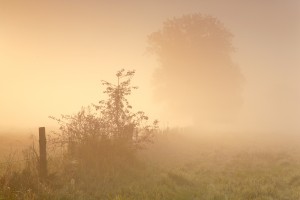 Twee groepen bomen in een veld tijdens een sneeuwbui.