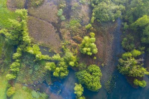 Het moeraslandschap van natuurreservaat de Hauw in de Damvallein gezien vanuit de lucht op een nevelige ochtend in het voorjaar.