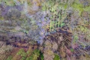 Natuurreservaat Bos 't Ename gezien vanuit de lucht op ene mistige ochtend tijdens de herfst