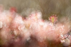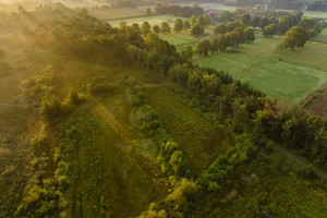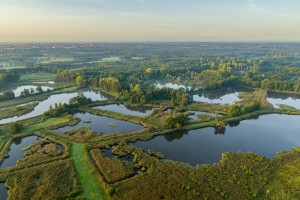 Natuurgebied de Kruibeekse polder met grachten, vijvers en dode bomen op een mistige voorjaarsochtend gezien vanuit de lucht.